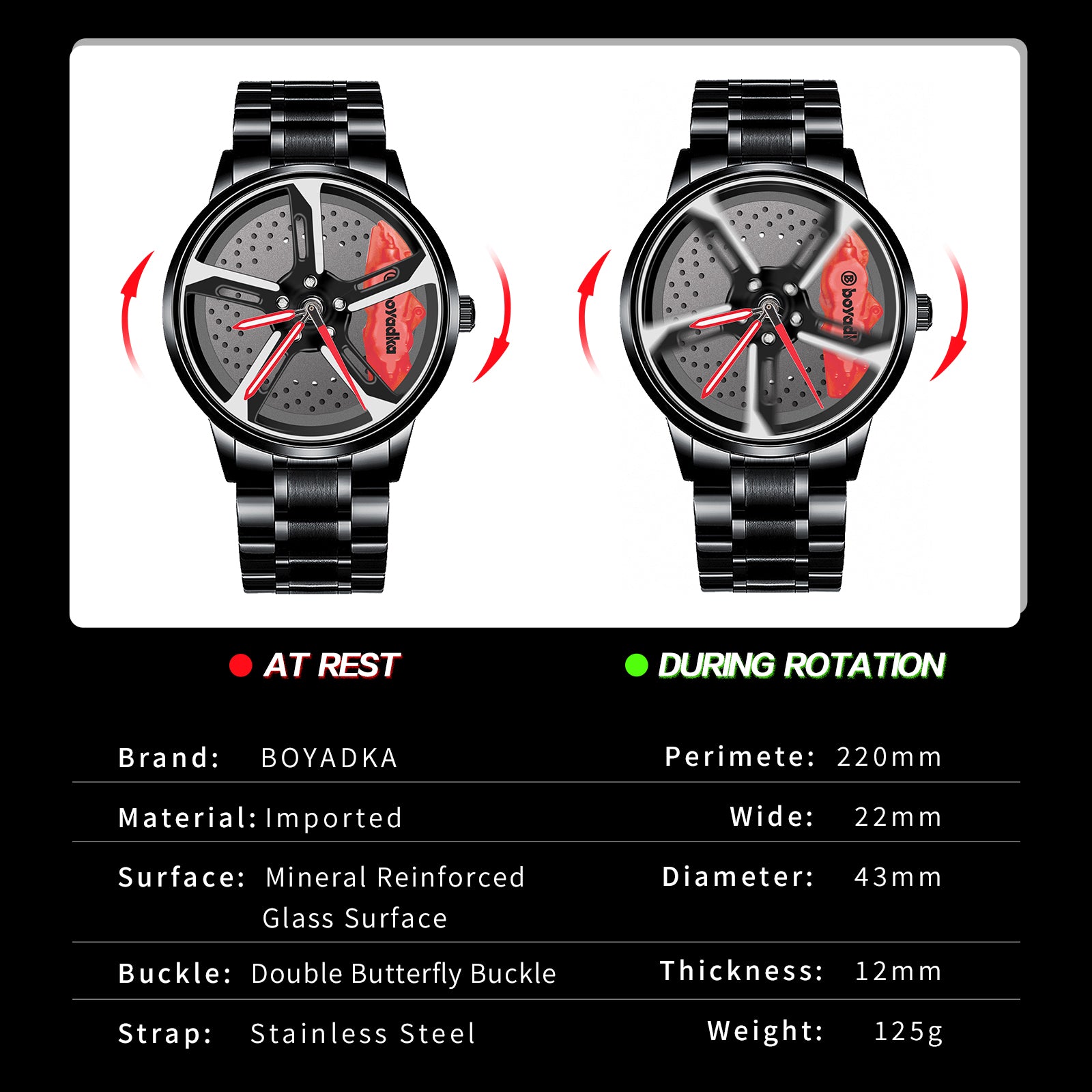 【Spinning by flick your Wrist】: We inspired by high-end sports car wheel rim and sport brake caliper shape, hollow dial design ingeniously combined racing car elements and watch elements, perfectly demonstrated the beauty of machinery. Nice gift for men/boy!