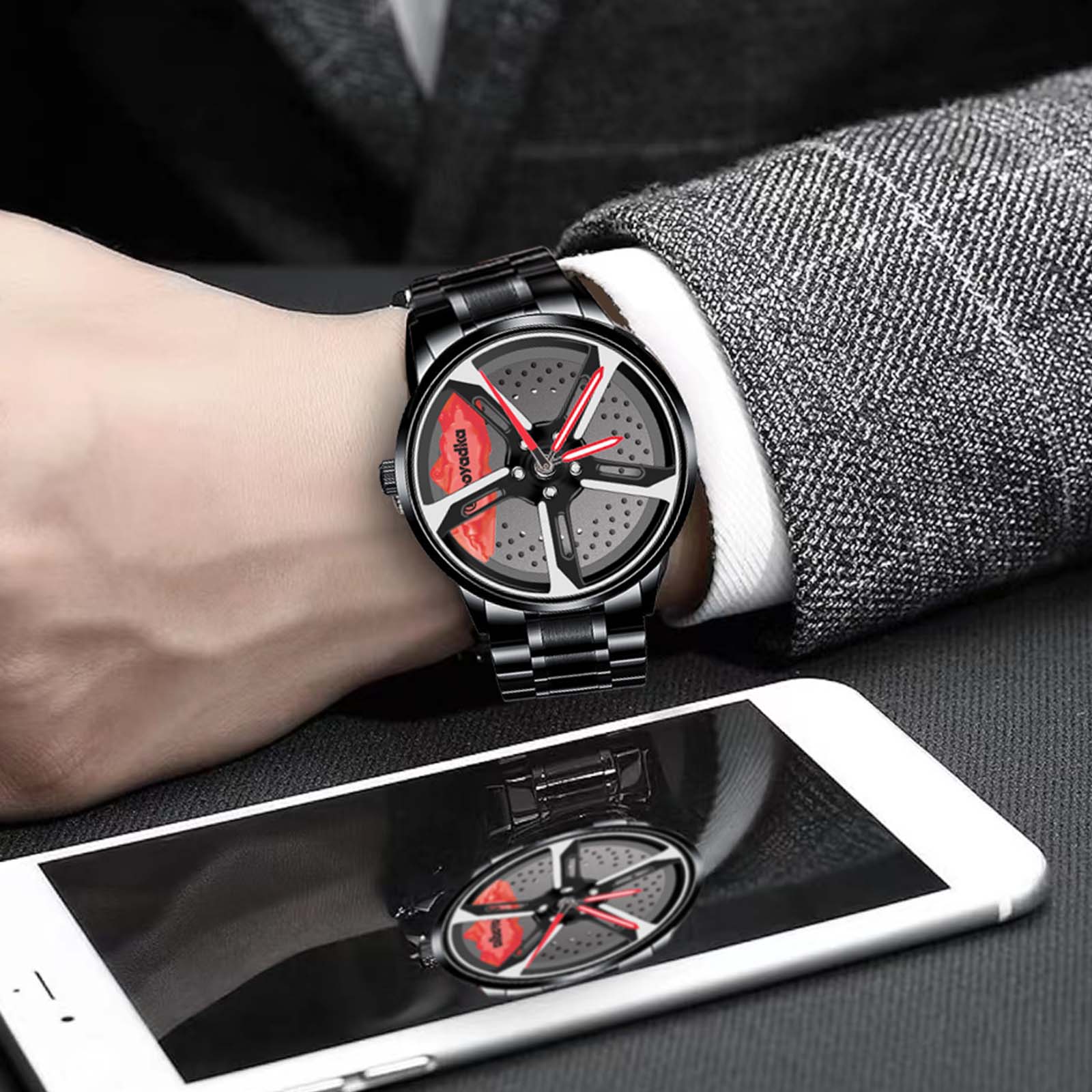 Spinning Car Watch with Stainless Steel Band Waterproof Japanese Quartz Wrist Watch