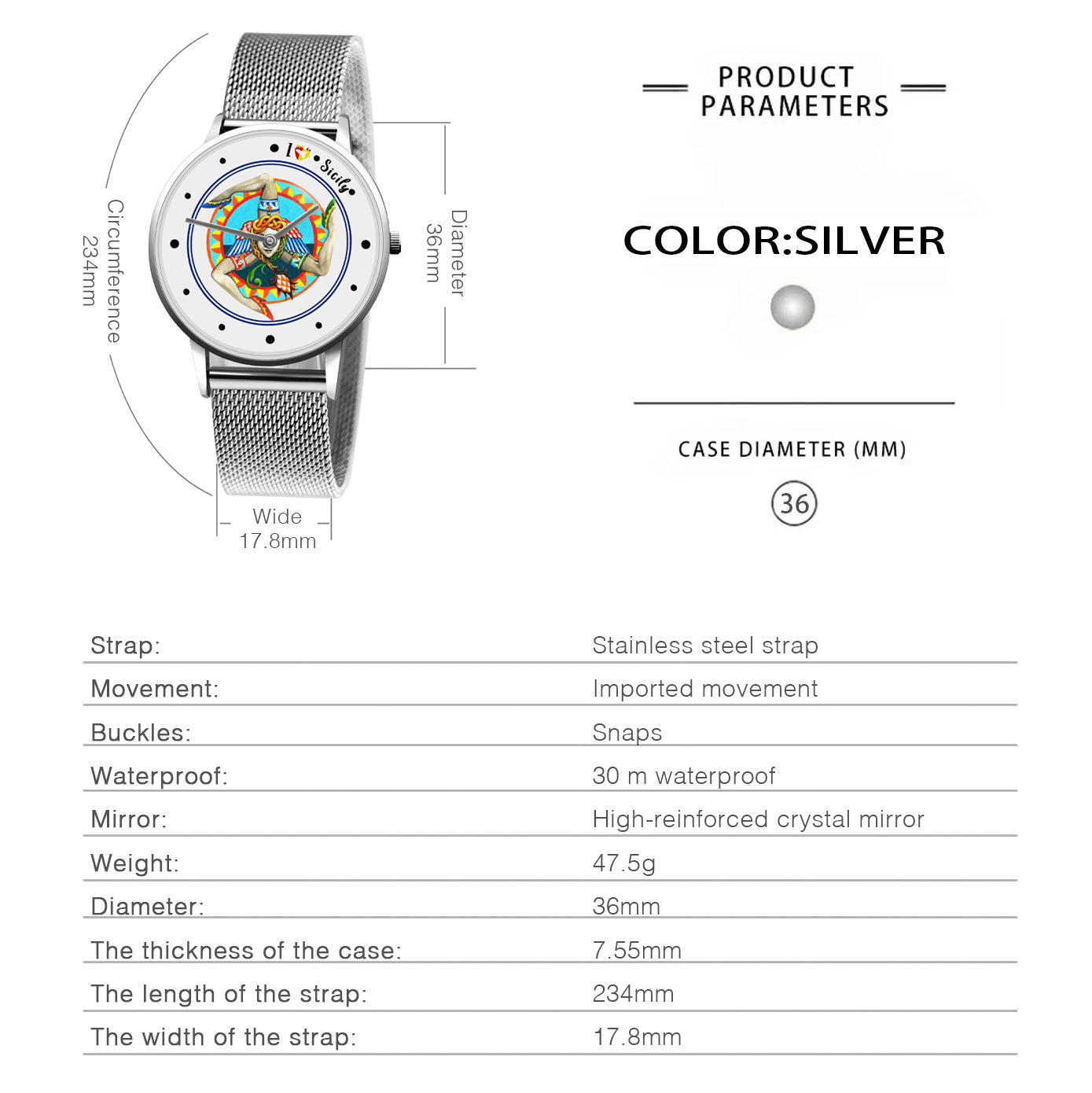 *Dial diameter: 36mm Case thickness:7.5mm